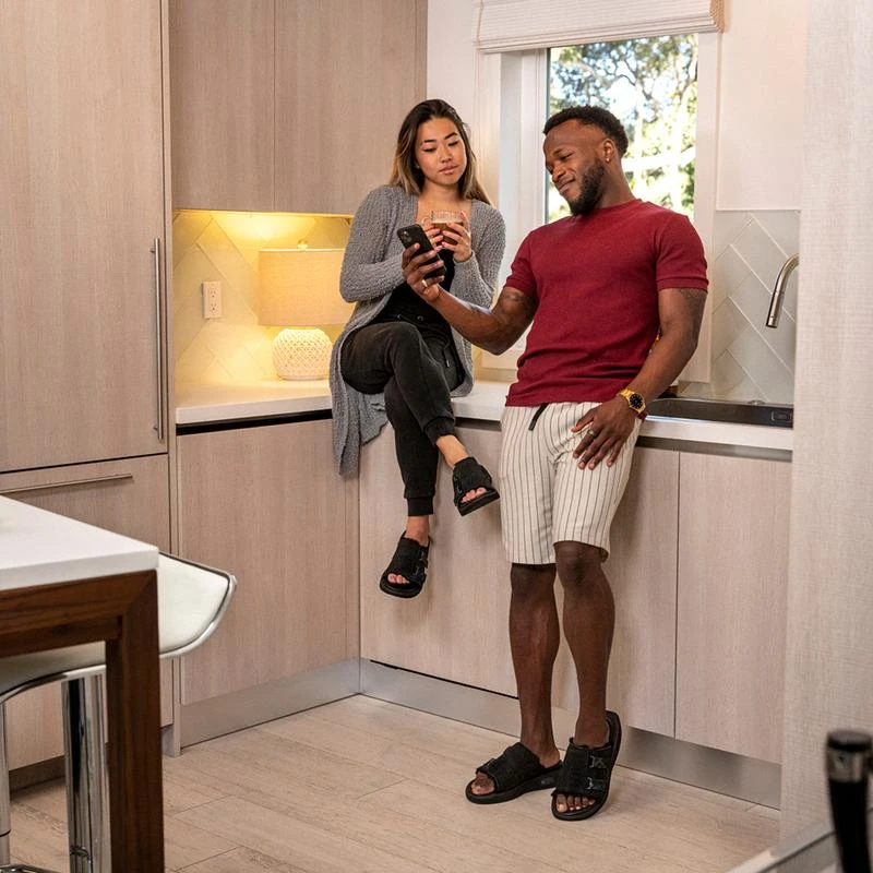 We looked at sandals from every angle and had a few aha moments. KO-Z sandals take those “ahas” and turn them into “aahs.” Whether for post-race recovery or a marathon of video conference calls, the simplest of footwear has been injected with extra doses of comfort in the places it matters most. It starts with five layers of foam to rest your foot upon, with ultra-soft memory foam closest to the foot. The memory foam embraces your foot’s shape and gives back a delightful cushion sensation that helps stabilize the foot. In the arch is a gift from our sheep friends – wool, which provides natural cushioning and moisture management. On top of the foot is thermoregulating sheepskin in an easy-going classic slide, with digitally printed webbing for an adjustable-fit foothold. With the addition of a rocker in the midfoot and an extended square tail rear, KO-Z sandals stay with your foot as you walk or run.